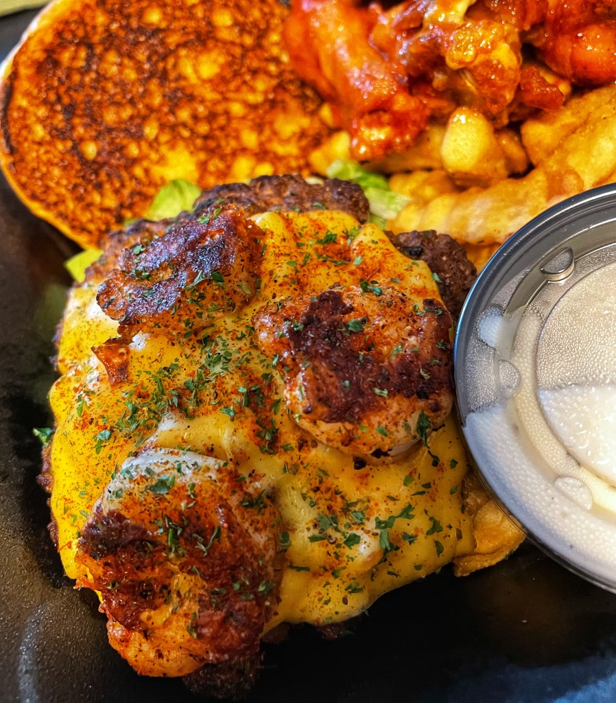 I placed orders at the truck and waited about 15-20 minutes since it was fairly busy around dinnertime and there were two people in the truck taking orders and filling them. There were a few tables outside where you can stand and eat, if you wish to do so, but most people got orders to go. The food was worth the wait. I got the Cajun Shrimp burger ($11), which comes with a fresh, never frozen, seasoned patty, cheese (ask for without cheese if you don’t want it), shredded lettuce, and three grilled shrimp topped with cajun seasoning. There’s also a side of crinkle cut fries, which were crispy and good. The burger had a home-cooked taste to it, made of simple ingredients but still robust in taste.