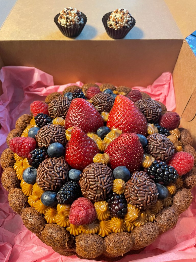 I was a little afraid the cake would be too sweet with the combination of brigadeiro on chocolate cake, but the cake part was not too sweet so it balanced out the sweetness of the dulce de leche and Brigadeiro on top. I really like how the cake was moist inside. They put dark brigadeiro on this cake so it not too sweet. If it is too sweet, you can always save the brigadeiros for later or give them to someone that has a major sweet tooth! This gorgeous cake is also topped with plenty of fresh strawberries, blueberries, and blackberries, which added tartness to balance the sweet as well! I enjoyed how they also included two extra caramel colored brigadieros, which had round crunchy sprinkles on them. These were such a sweet touch and tasted delicious!