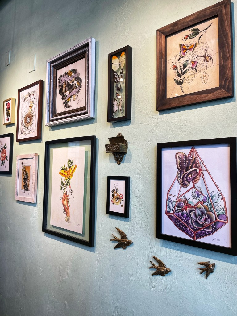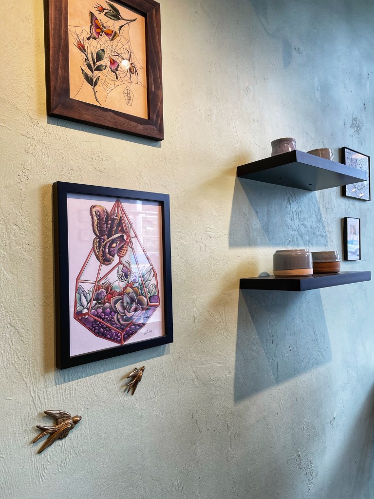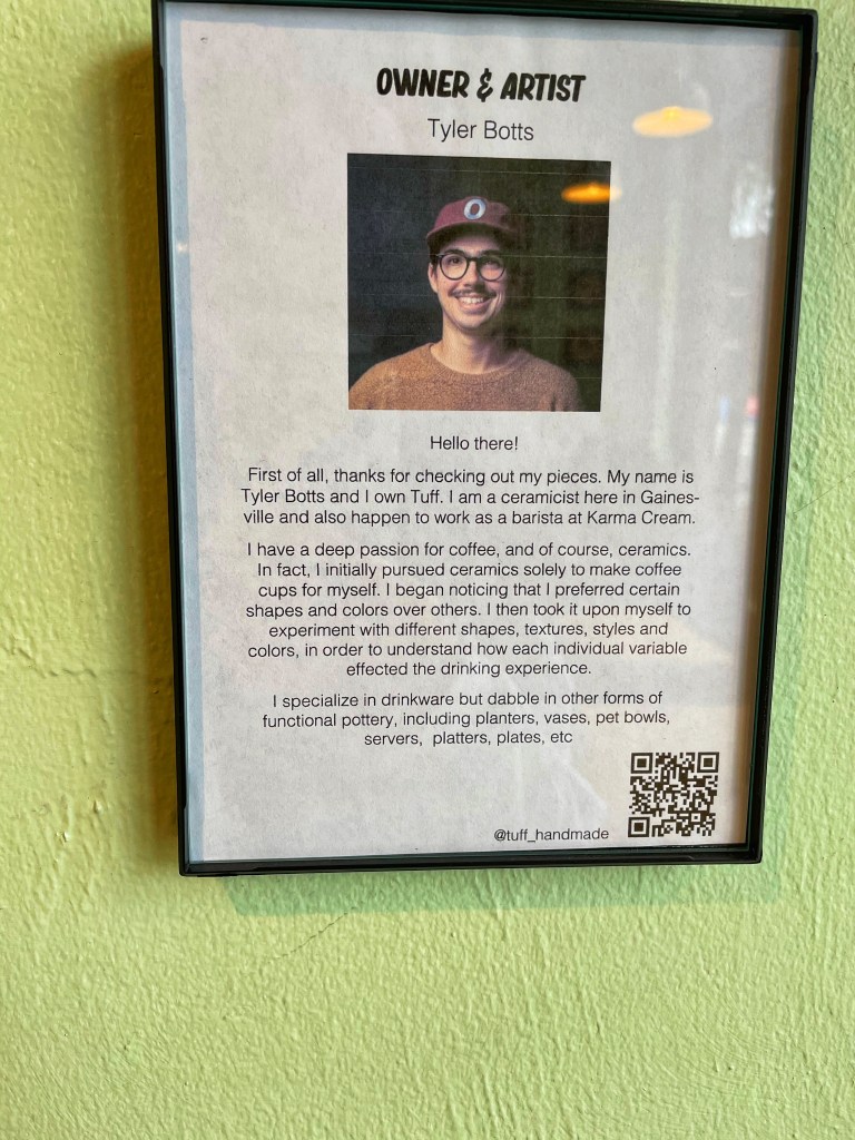 I liked how they feature local artists, such as Tyler Botts’s ceramic pieces and other drawings on the wall. Karma Cream is definitely a solid place for coffee, vegan food, and ice cream near campus!