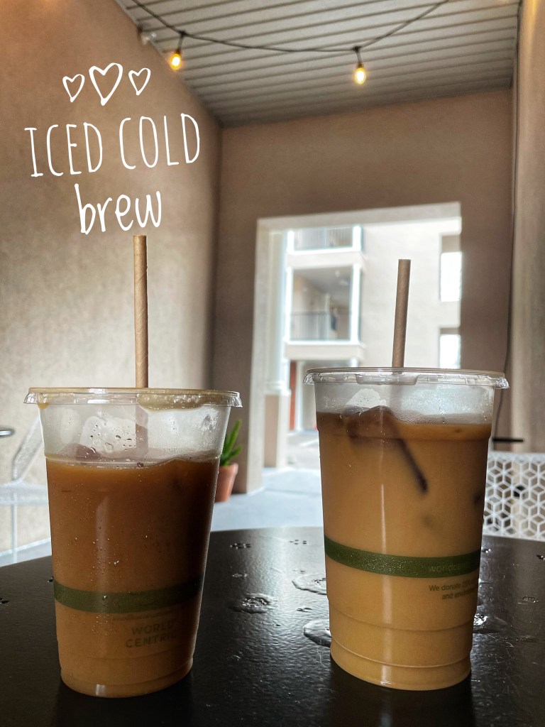 Iced Cold Brew (with oat milk on the right; with almond milk and rose syrup on the left)Coffee ice cubes don’t water down the coffee