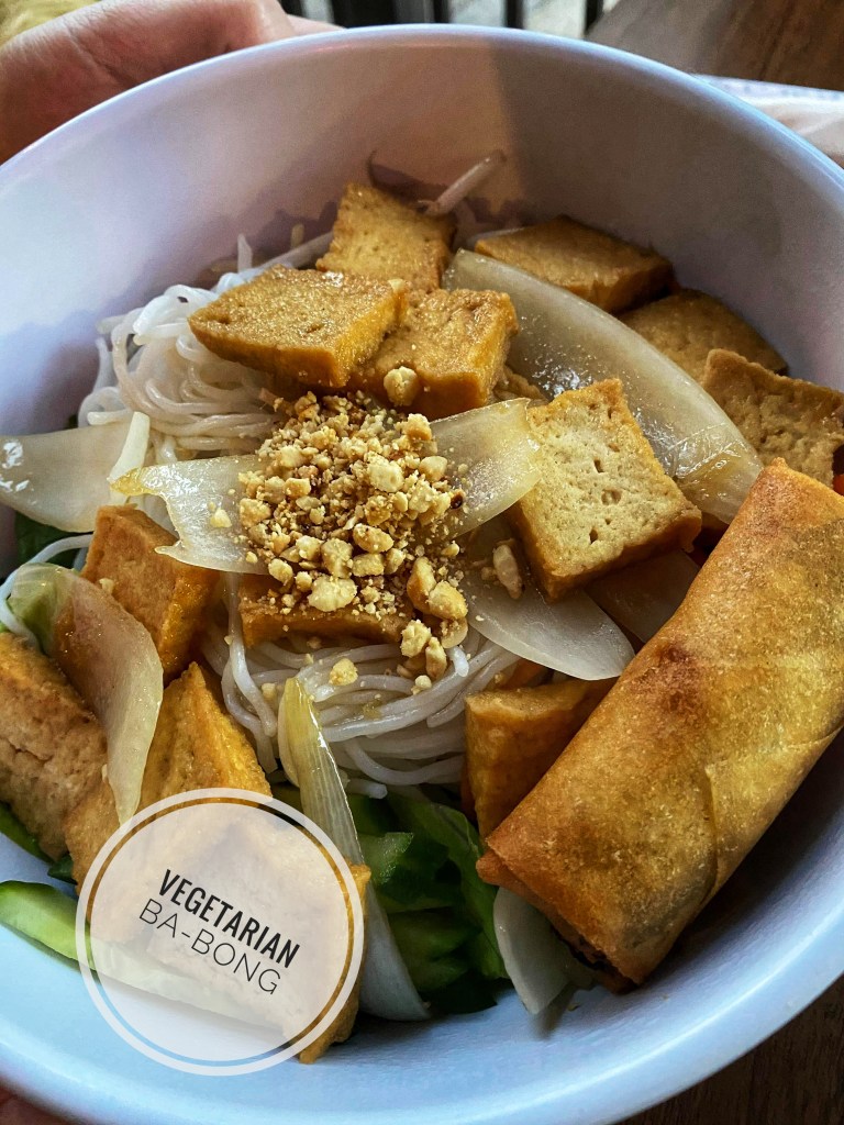 The vegetarian Ba-Bong, vermicelli noodles with veggies (lettuce, cucumber, bean sprouts, cilantro), egg roll, fried tofu, and topped with roasted peanuts, were also very good and comes with a side of house dressing that is vinegar-based.